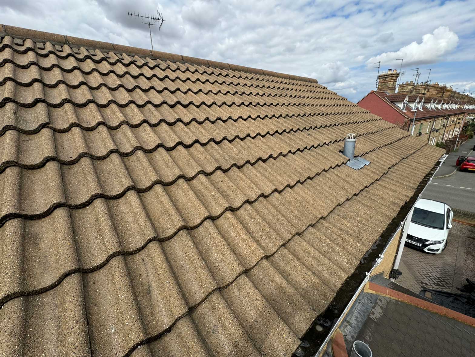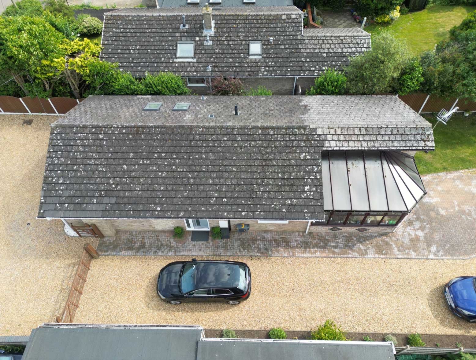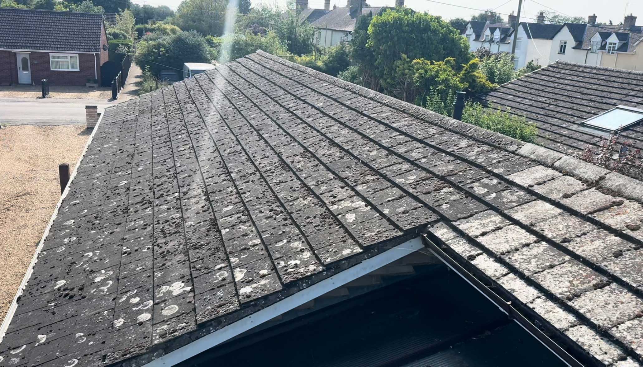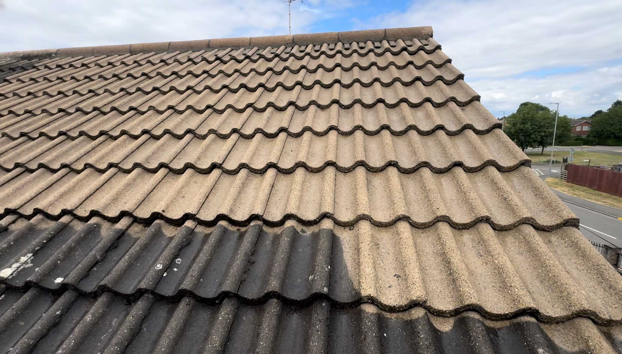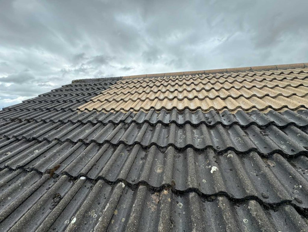 The roof is now clean and clear, with moss safely removed and the surface ready for biocide treatment.
