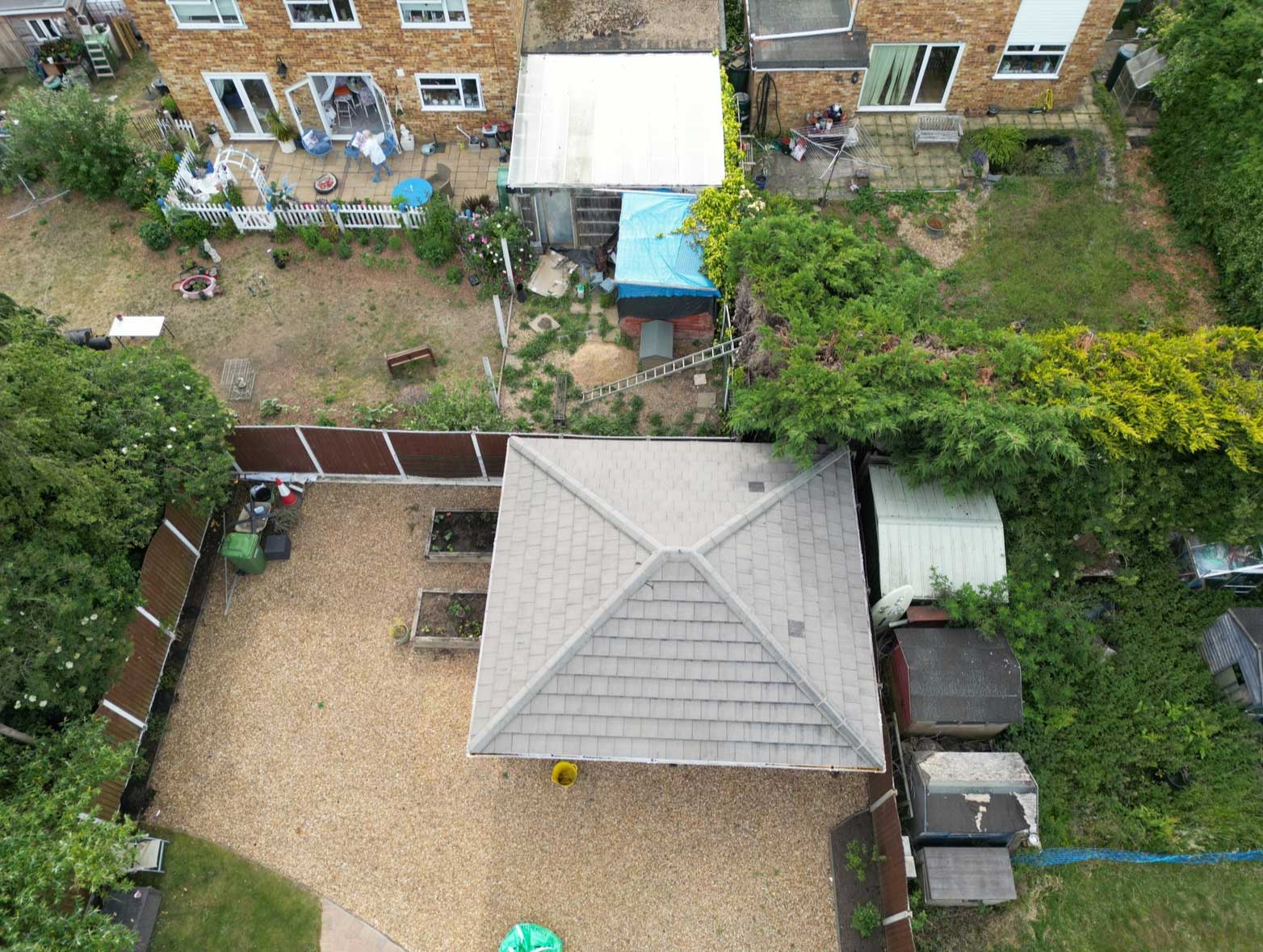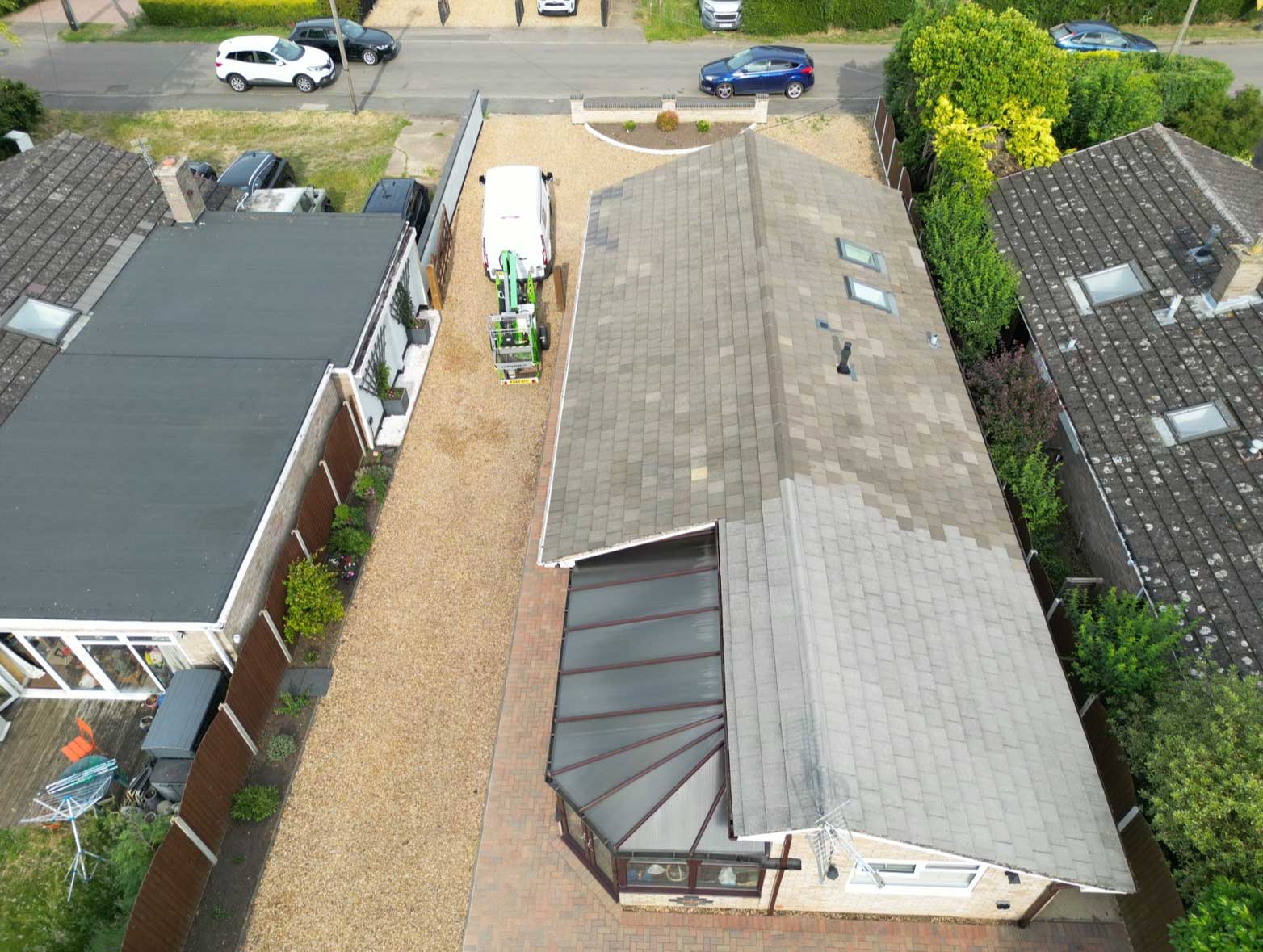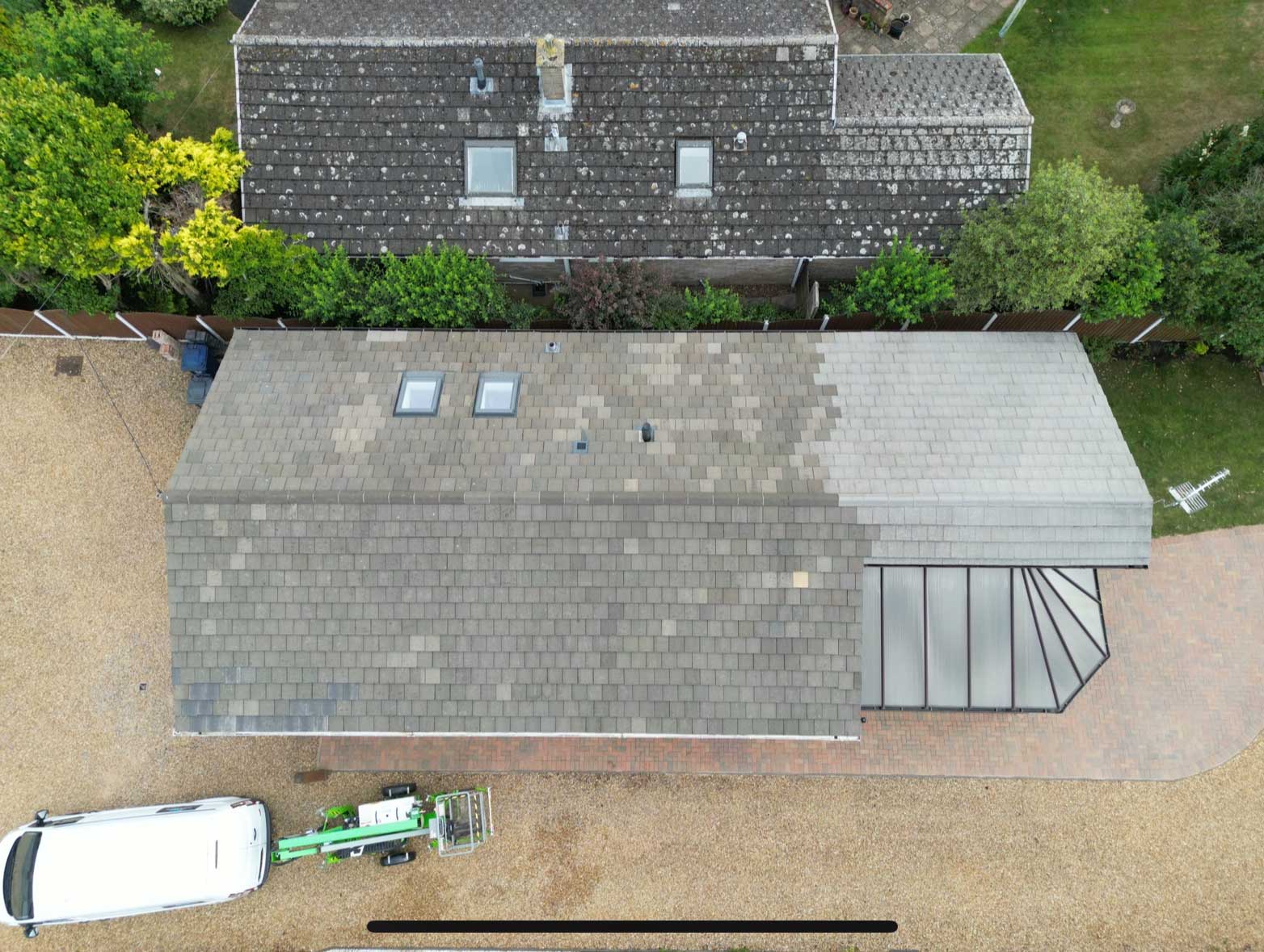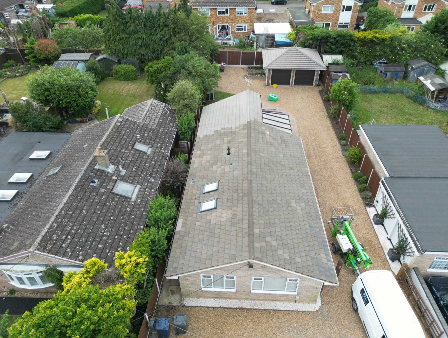 - We use a drone for the survey and either a cherry picker or a tower to access and clean the roof, ensuring we never have to step directly on it.