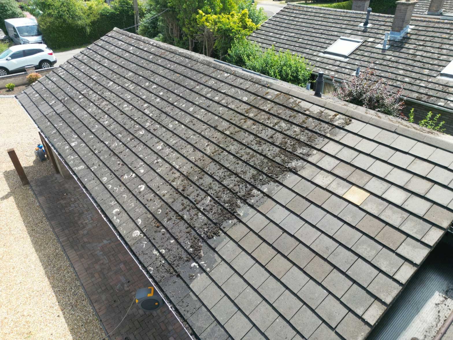Our specialist air scraper in action — gently removing moss without harming the tiles.